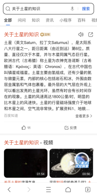 这时,果核点击页面最下方“关于土星的知识”,就跳转到了QQ浏览器搜索的界面中,出现不同类型关于土星的内容,让果核对这个未知的星球,又多了一些认知。