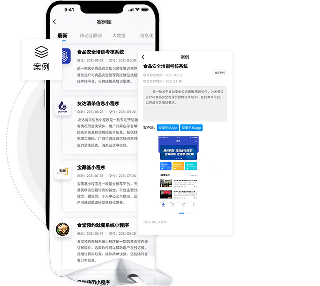 项目案例对于客户是重要的参考依据,所以在案例库详细的展示了包括案例简介、类型、界面等信息,方便用户实时查看。